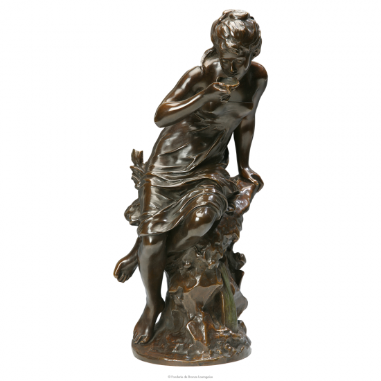 En appui sur un socle rocheux, vêtue d'un léger drapé, une jeune femme porte à la bouche une huitre et y découvre une perle rare. Statue en bronze sculptée par Moreau, famille de Dijon.