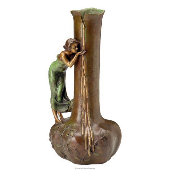 Vase à fleurs en bronze à long col. L'embouchure échancrée est à débordement. Avec grâce et délicatesse, une jeune femme se désaltère au creux de sa main. Un bel objet de décoration signé RANIERY